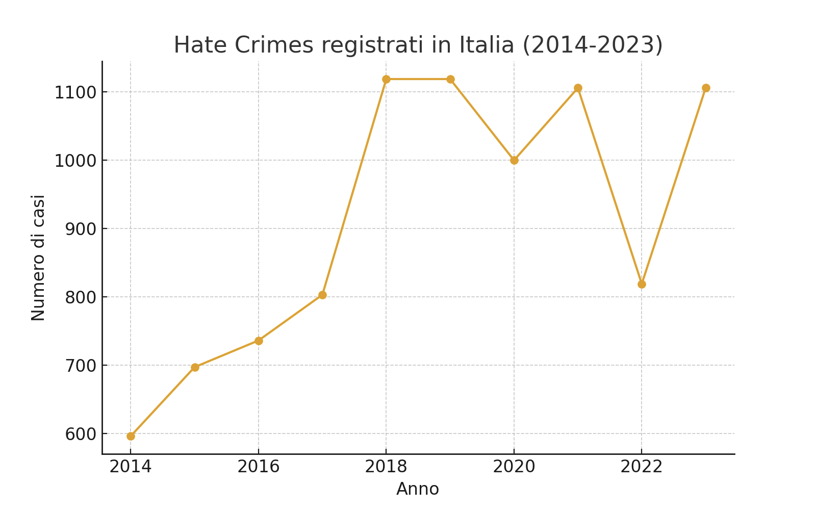 Secondo dati forniti dalla Polizia e raccolti da Statista, gli hate crimes registrati in Italia mostrano un trend altalenante, ma generalmente elevato negli ultimi anni. Il grafico qui sotto evidenzia l’andamento tra il 2014 e il 2023: