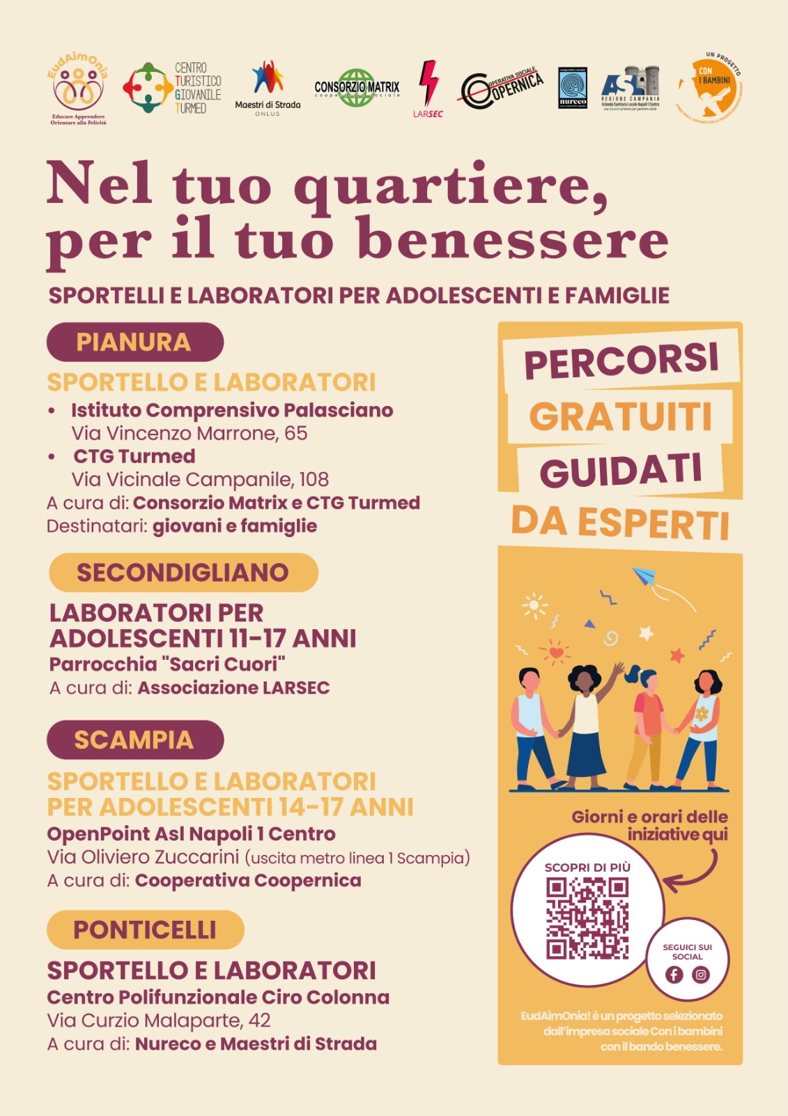 Napoli – In una città dove episodi di violenza giovanile e situazioni di disagio psicologico sono sempre più frequenti, nasce una risposta concreta e capillare: “EudAimOnia! Educare Apprendere Orientare alla Felicità”, progetto selezionato da Con i Bambini nell’ambito del Fondo per il contrasto della povertà educativa minorile. L’iniziativa entra ora nel vivo con l’attivazione di sportelli e laboratori gratuiti rivolti ad adolescenti e famiglie nei quartieri di Pianura, Secondigliano, Scampia e Ponticelli.