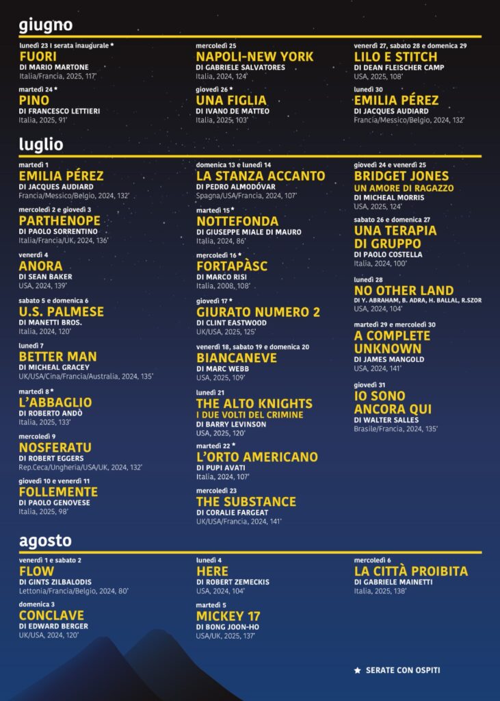 Martedì 16 luglio, la rassegna rende omaggio al giornalista Giancarlo Siani, assassinato dalla camorra nel 1985. In occasione della proiezione del film “Fortapàsc” di Marco Risi, saranno presenti il fratello Paolo Siani e il nipote Gianmario Siani, insieme a Roberto Napoletano, direttore de Il Mattino, e figure istituzionali come Federico Cafiero De Raho e il sindaco Giorgio Zinno.