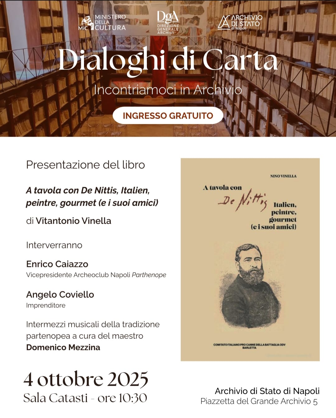 Come da prassi, dopo l’evento l’autore lascerà in dono una copia della sua opera alla Biblioteca dell’Archivio di Stato di Napoli.