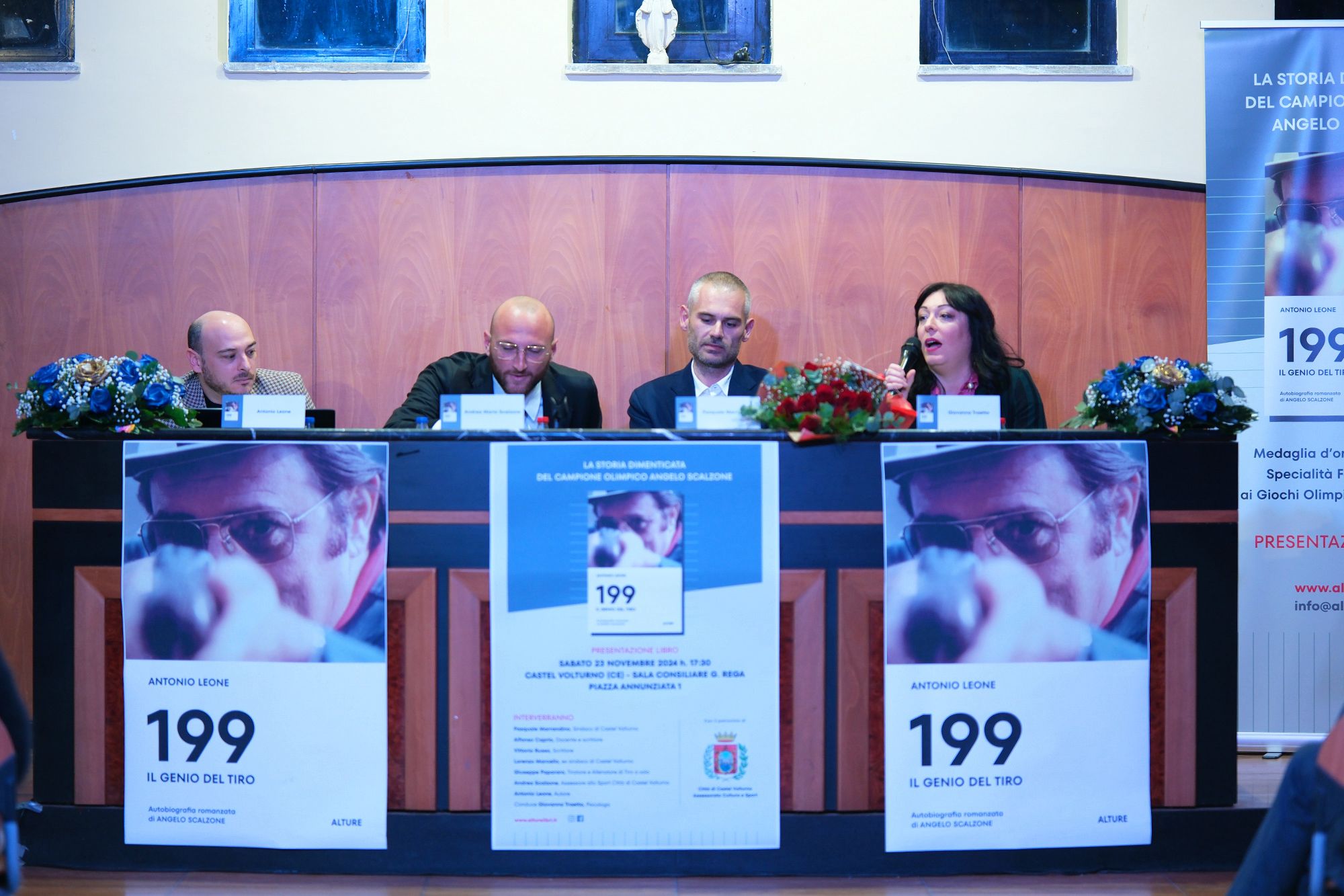 Nella foto da sin. Antonio Leone, Andrea Scalzone (nipote di Angelo ed oggi Assessore alla Cultura del comune di Castel Volturno), il sindaco di Castel Volturno, Pasquale Marrandino, Giovanna Traetto, in occasione della presentazione del libro “199 – l genio del tiro” di Antonio Leone (Alture, 2024).