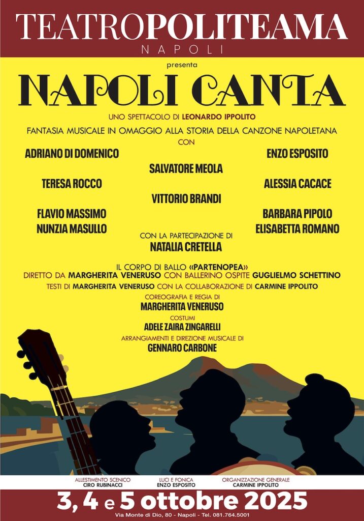 Napoli – Debutta al Politeama di Napoli, invia Monte di Dio 80, in scena da venerdì 3 a domenica 5 ottobre 2025, “Napoli Canta”, il nuovo spettacolo di Leonardo Ippolito. Ideato per celebrare e valorizzare l’immenso patrimonio della canzone classica napoletana, espressione artistica e culturale tra le più significative e riconosciute a livello internazionale, lo spettacolo è in omaggio per gli abbonati alla stagione 2025//26 del teatro Augusteo.